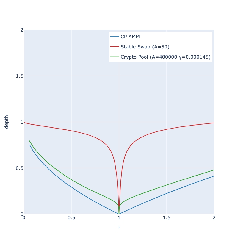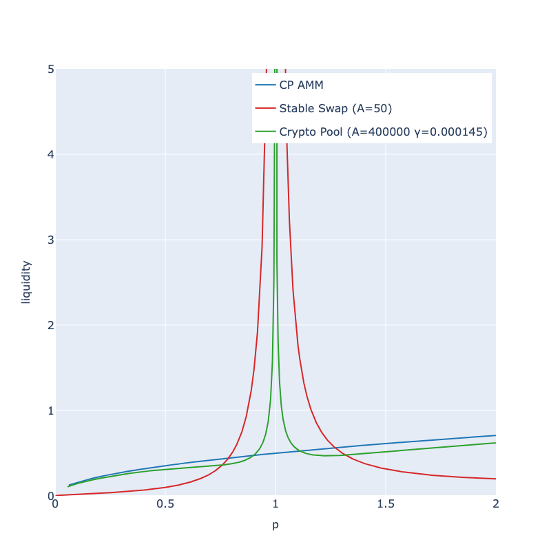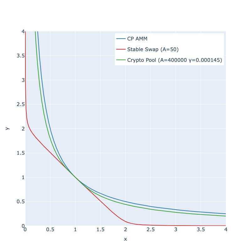 The below graph compares the curves of Crypto Pool, CP-AMM, and StableSwap.