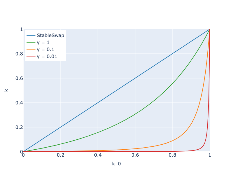 The below graph shows the relationship between K₀ and K for several γ’s(Note that we get the StableSwap formula when substituting K = AK₀).