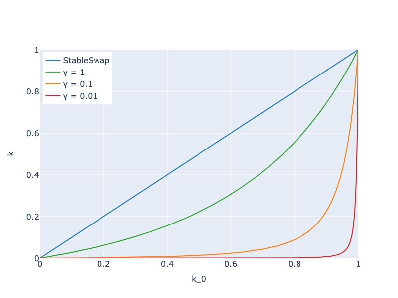 diverging to infinity gives us CS-AMM. Remember, our curve needs to behave like StableSwap near the equilibrium point, but approach CP-AMM faster than StableSwap when moving away from it, meaning a faster reduction of K