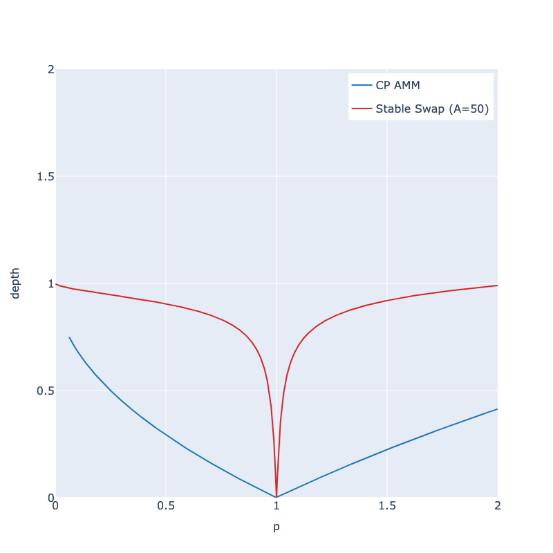 As evident in the above chart of A=50, Stableswap provides eminently higher depth around the center compared to CP-AMM. Numerically, Stableswap provides 46 times bigger liquidity at 1%-depth — the depth for 1% price change. Using 2,000 for A in fact guarantees 168 times bigger liquidity at 1% depth. (For a pair of non-volatile stablecoins, A is usually set to a number bigger than 2,000.)