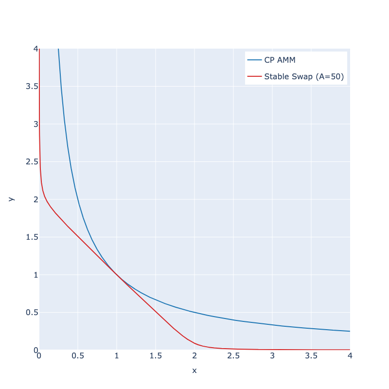 With this in mind, Stableswap was designed to follow the CS-AMM curve around 1:1 price range, but asymptotically approaches the CP-AMM curve beyond that range.