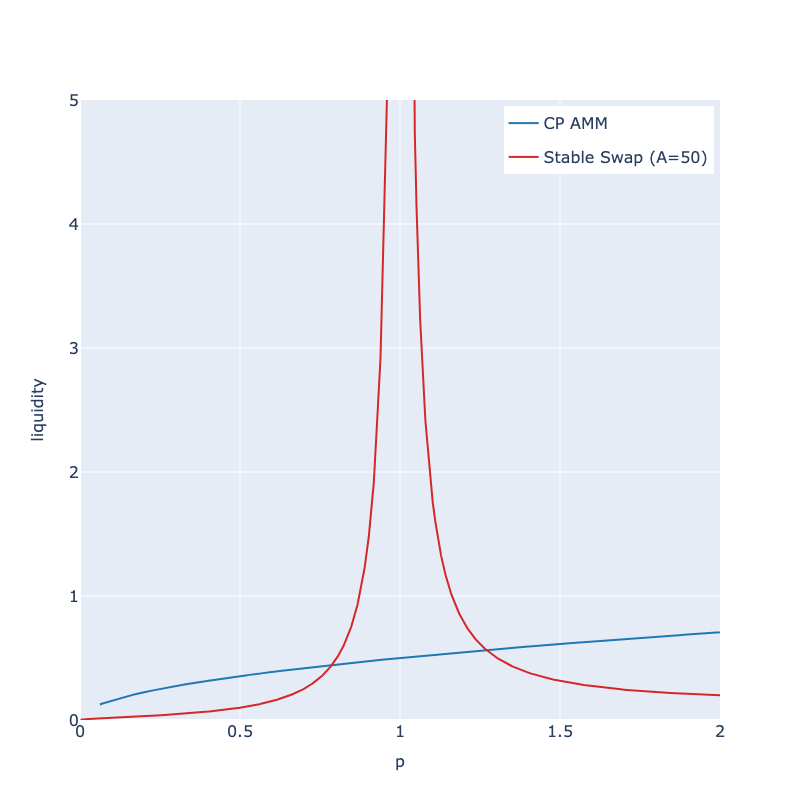 In this sense, CP-AMM can also be viewed as an order book trading system that contains nearly uniform amount of bid/ask orders for every price point(from 0 to infinity). This form of liquidity would be suitable for swaps between assets with high price volatility, but extremely inefficient for swaps between stablecoins. This is because whereas stablecoins are mostly likely stable around one dollar(with few exceptional cases☹️), CP-AMM wastes most of its liquidity on prices beyond the 1:1 price range. Moreover, the trader needs to take on higher slippage costs than is actually needed.